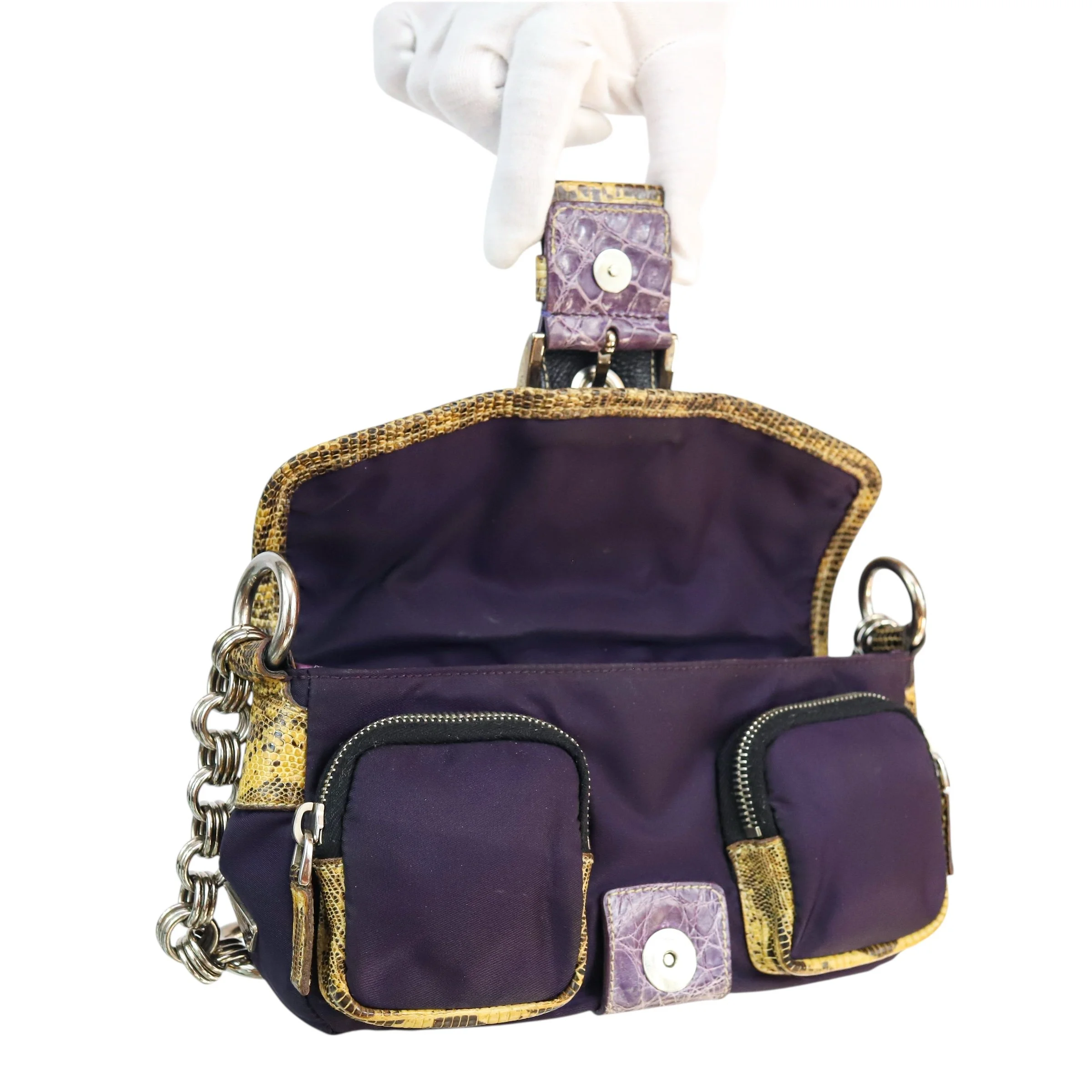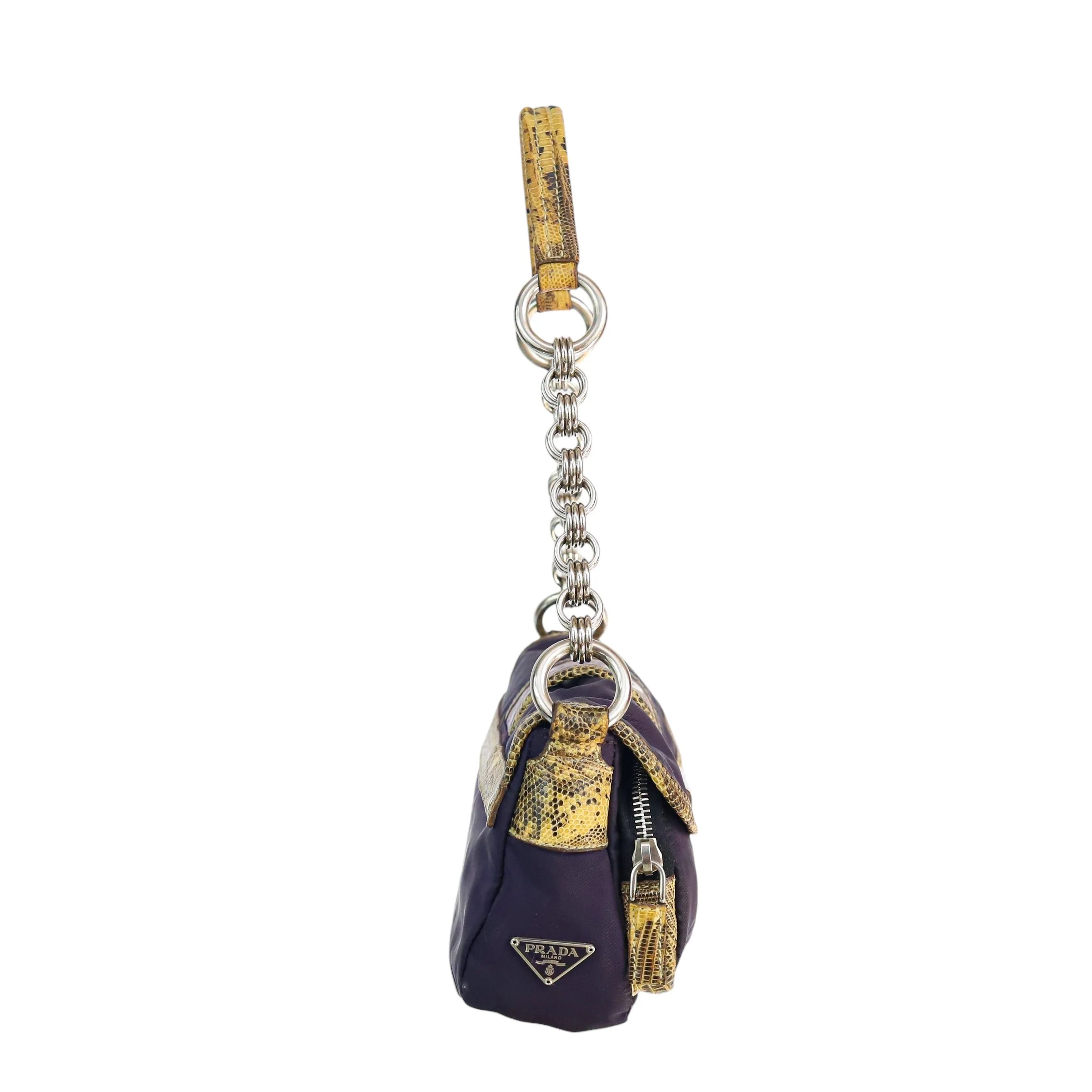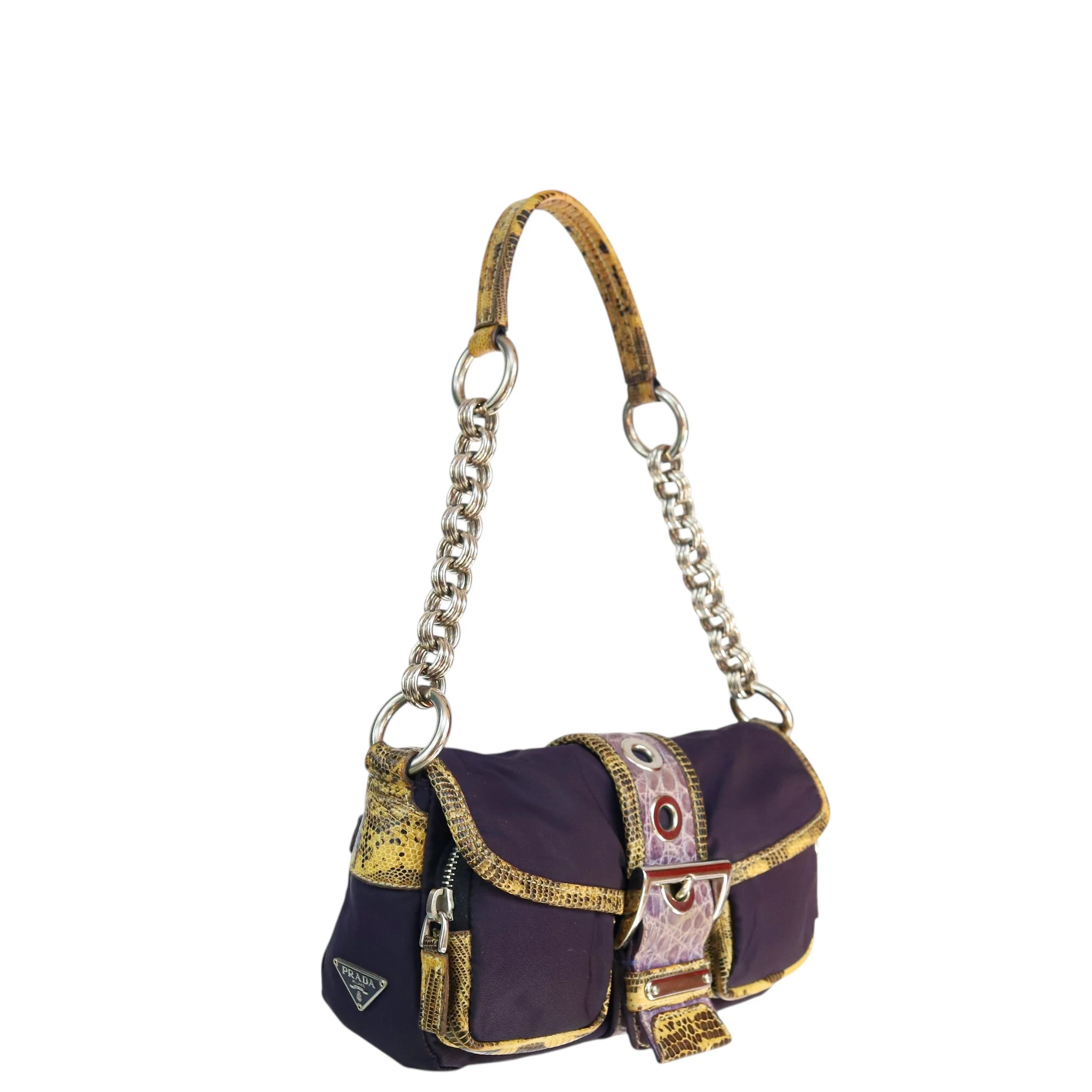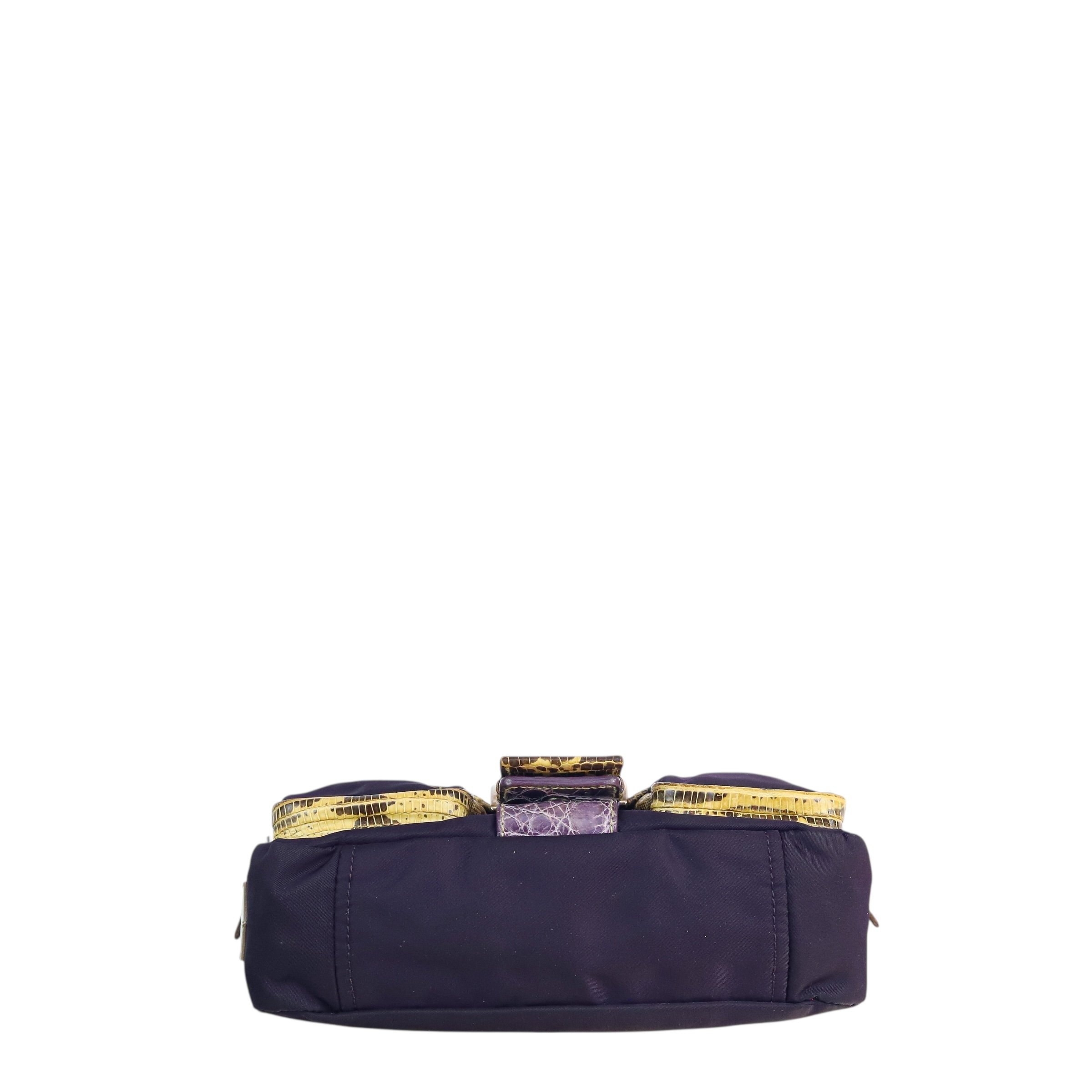 purple nylon, contrast yellow lizard trim & embossed purple leather