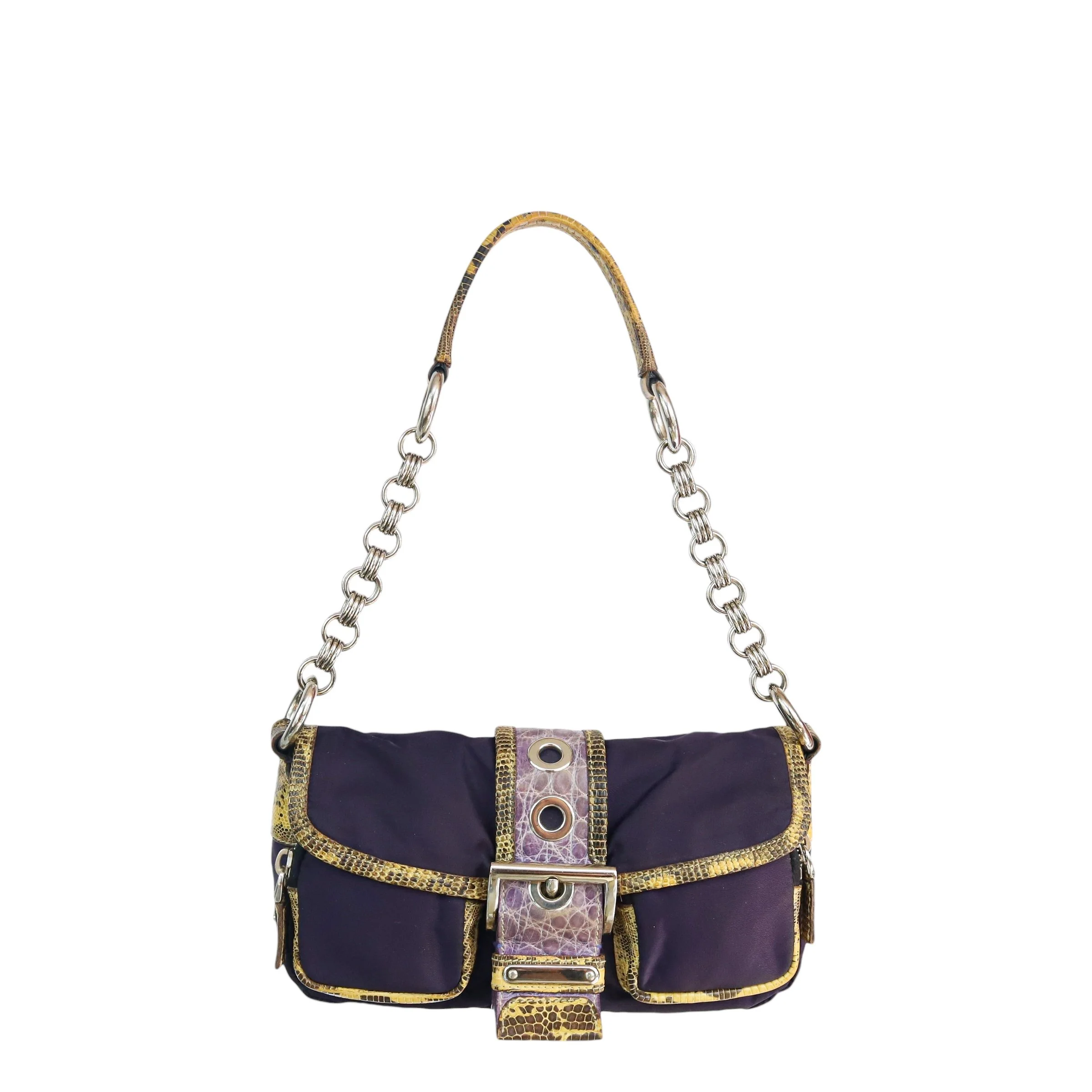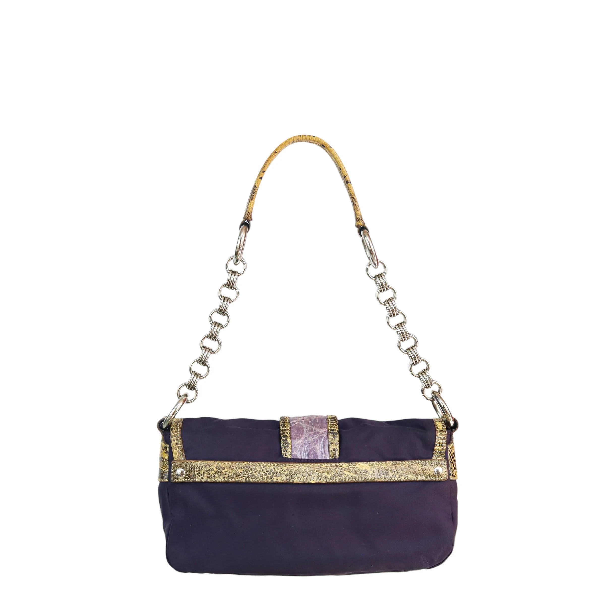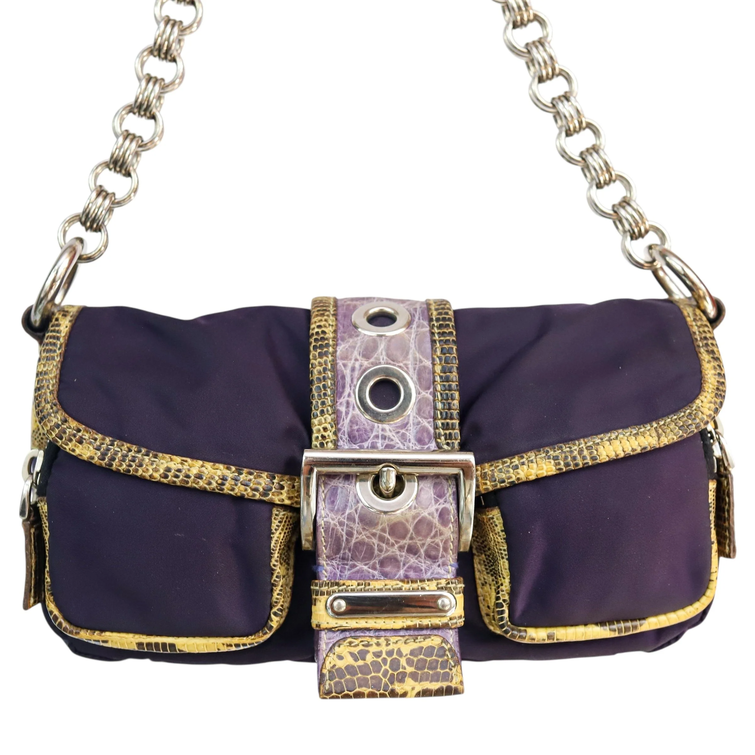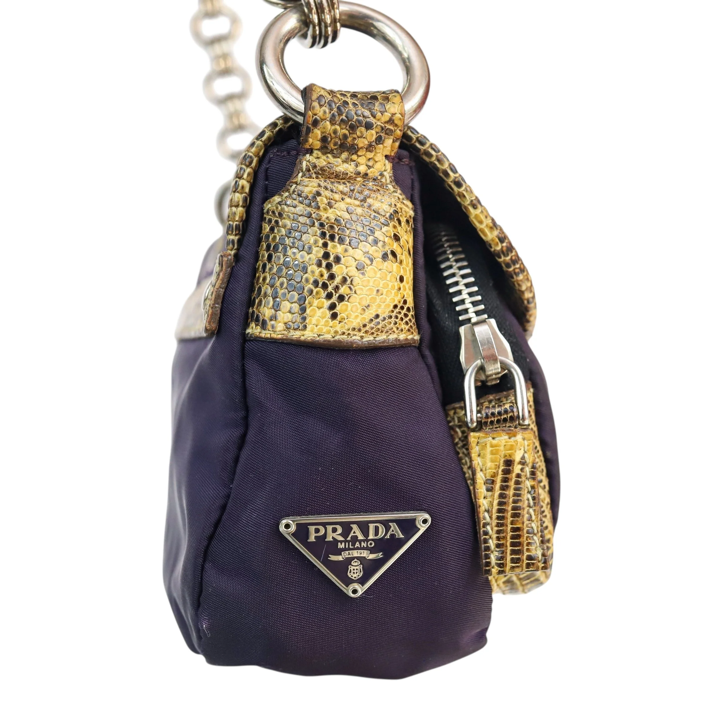 purple nylon, contrast yellow lizard trim & embossed purple leather